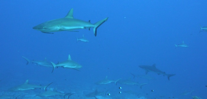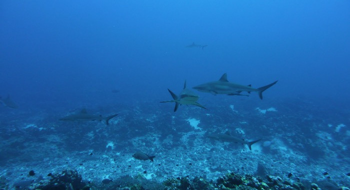 Nous les quittons pour nous immerger à trente mètres au milieu d'un jardin de corail semblable à des pétales de roses, habité de petits poissons curieux qui se collent à nous pour un bout de chemin. Puis nous arrivons sur le mur de requins que nous regardons évoluer, ébahis. Pas le temps d'avoir peur, la curiosité l'emporte. Le spectacle est fascinant. Une autoroute à sens unique aux heures de pointe. Tous dans le même sens, portés par le courant. Il y en a partout où le regard se porte. 400 en temps normal. Tapis dans une grotte profonde pour observer de près ces squales à l'oeil torve et au sourire narquois indifférents à notre groupe, nous en prenons plein la vue. Mérous, raies aigles, demoiselles, poissons flûte, papillons, labres de toutes sortes, napoléons, passent au second plan.