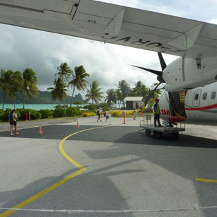 Au milieu du plus grand océan de la planète, le Pacifique, se trouve Maupiti. Ici la barrière de corail fait son travail et protège l'île des violents assauts de la mer et des vagues qui déferlent et s'écrasent sur cet anneau que l'on peut voir du ciel. La plus petite des îles sous le vent située à 40 km de Bora Bora est l'une des plus belles de la Polynésie et certainement la plus tranquille et authentique de l'archipel de la Société. Elle nous accueille chaleureusement avec ses 1300 habitants. L'arrivée sur l'île se fait par avion, sur l'aéroport le plus minuscule que nous ayons jamais vu, proposant une navette qui assure les transferts sur l'île principale, en bateau. Nous nous sommes entassés à une vingtaine de passagers avec les bagages dans un bateau de 12, par un temps très mauvais, au plus ras de l'eau, mais... doucement ça l'a fait. Sandra nous attendait sur le quai avec de magnifiques colliers de fleurs pour nous mettre dans l'ambiance de cet art de vivre.